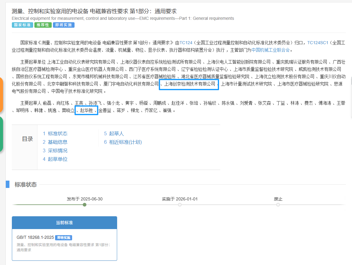 最新消息,2025年06月30日,根据国家标准化管理委员会官网显示,中国国家标准公告,创京检测总经理赵华胜参与编制的标准GB/T 18268.1—2025《测量、控制和实验室用的电设备 电磁兼容性要求 第1部分:通用要求》推荐性国家标准批准发布,新版标准将于2026年1月1日起正式实施。